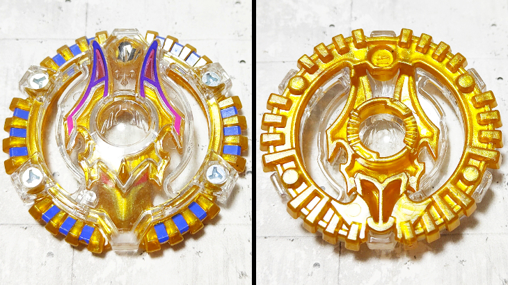 冥界の守護神アヌビスモチーフ。小型で円形な形状が軸をぶれにくくし、細かい突起がついた下段刃が攻撃を分散させるディフェンス系のデュアルレイヤー。