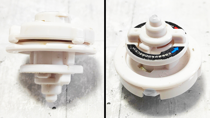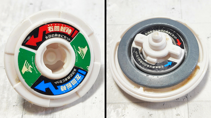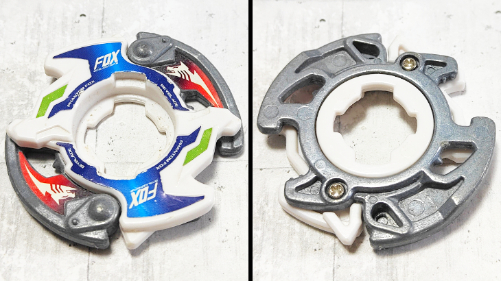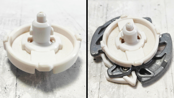 アタックリング側のコアをディスク側の上に装着することでセッティング可能。バトル中の衝撃で上側のコアが分離しバトル中に2機に分離します。仕組みとしてはベイブレードバーストシリーズのバーストシステムと同じです。また、セッティングの向きを変えることで左右どちらの回転にも対応できるようになっています。