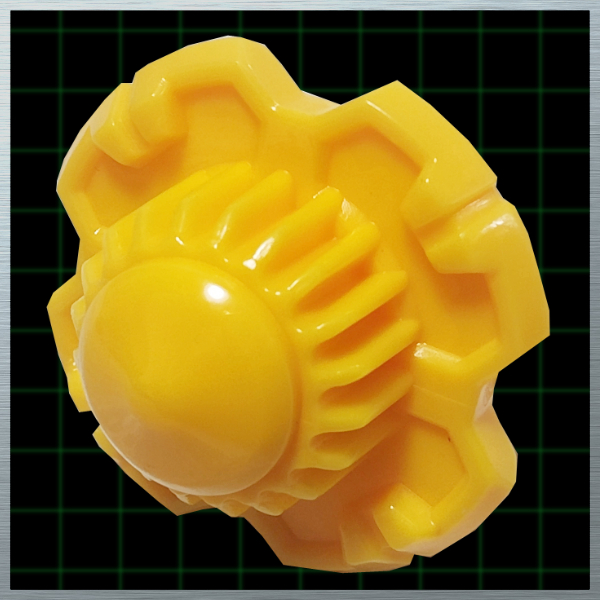 大型ギヤ搭載のフラット軸による動的な攻めと、中央の突起による静的な守りを併せ持つ設計。