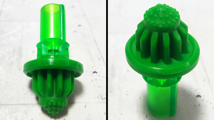 軸先にある複数の突起がスタジアムとの摩擦を高め、攻撃を受けても押し出されにくい設計。 |