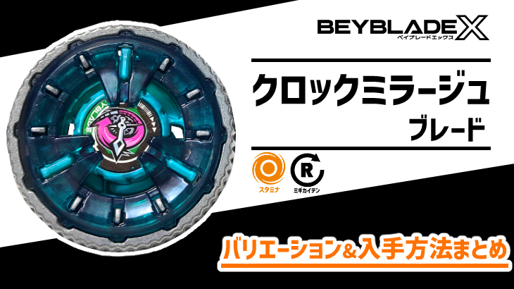 ベイブレードXのブレード「クロックミラージュ」の基本情報と、カラーバリエーションや入手法をまとめています。