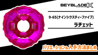 パーツ紹介 ラチェット 9-65(ナインシクスティーファイブ) 性能&入手方法【ベイブレードX】 ベイブレードXのビット「9-65(ナインシクスティーファイブ)」の基本情報と、カラーバリエーションや入手法をまとめています。基本情報9-65ベイを低めにセットするパーツ。ビットのバースト耐性を一定にする構造によりブレが少ない、シンプルタイプ... 2025.10.16 パーツ紹介